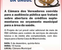 A Câmara dos Vereadores convida para a audiência pública que irá tratar sobre abertura de créditos suplementares no orçamento municipal para a área da saúde. O projeto de lei prevê valor adicional de mais de R$ 5 milhões para custeios de serviços da atenção básica e da média e alta complexidade, com destaque para a Santa Casa de Misericórdia.