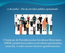 O INPAR parabeniza a todos os servidores aposentados neste dia 17, por todo seu trabalho prestado e dedicação à manutenção de serviços à sociedade, com transparência, zelo e eficácia. Estamos certos de que muito do sucesso do trabalho feito atualmente é legado daqueles que cumpriram com zelo suas funções em todas as carreiras no município.