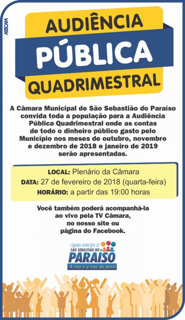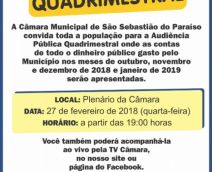 A Câmara Municipal convida todos a participarem da Audiência Pública Quadrimestral, que irá apresentar a prestação de contas de todo o dinheiro público utilizado pelo município de outubro de 2018 a janeiro de 2019.
